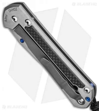 This Chris Reeve Large Sebenza 21 folder features carbon fiber inlays! The finished product is nothing short of astonishing! The carbon fiber is a top-notch addition to an already outstanding knife. The inlays are set into the satin finished titanium frame. The inlays fit exactly into each of the three pockets machined into the handle, two on the front and one on the back. The S35VN steel blade is polished with a blue anodized thumb lug and matching spacer on the handle. The handle edges, lockbar and pocket clip are bead blast finished.