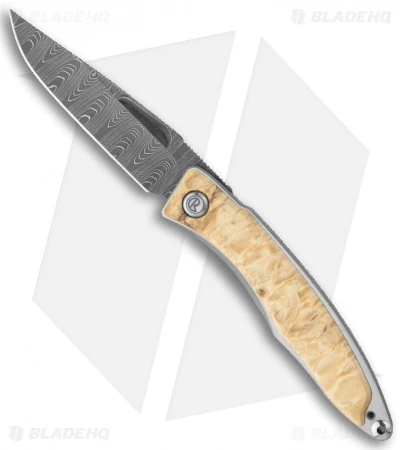 The handle utilizes bead blasted titanium with Box Elder Burl inlays front and back. The Integral Lock provides stout locking, while the reversible tip-up pocket clip makes the Mnandi easy to keep around. This model has a Devin Thomas stainless Ladder Damascus steel blade. Machined on both sides with an enlarged thumbnail recess for easy opening.