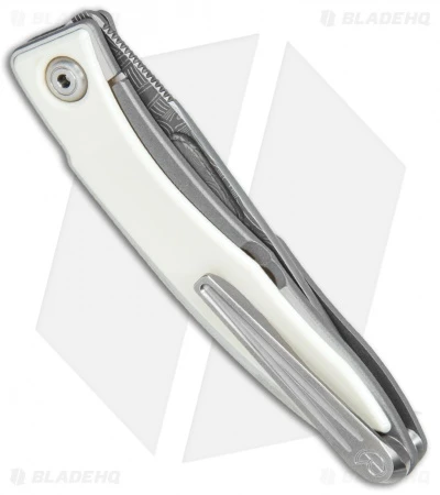 This Chris Reeve Mnandi features a bead blasted titanium frame with mammoth ivory scales and a Devin Thomas stainless Damascus steel blade. Enlarged thumbnail recesses in the blade allow easy opening, and the Integral Lock provides dependable lockup. Includes a reversible pocket clip and a small calfskin leather pouch for comfortable everyday carry.
