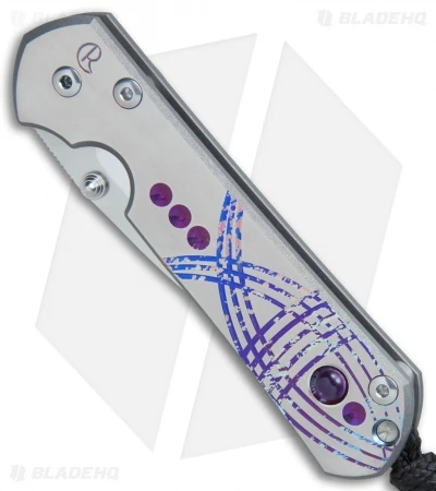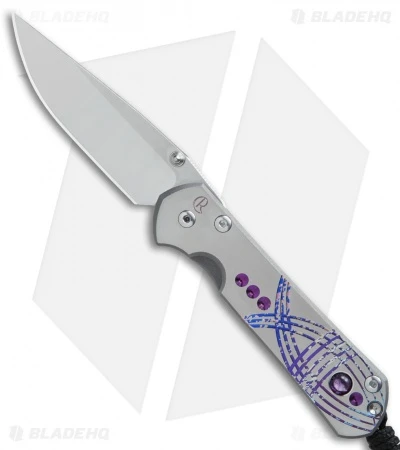This Small Sebenza 21 features a satin finished titanium handle face with a Unique Amethyst Cabochon Graphic. The framelock and pocket clip are bead blast finished. Item sports a satin finished thumb lug and spacer. This Sebenza model has a polished S35VN stainless steel blade. Includes lanyard and leather pouch.