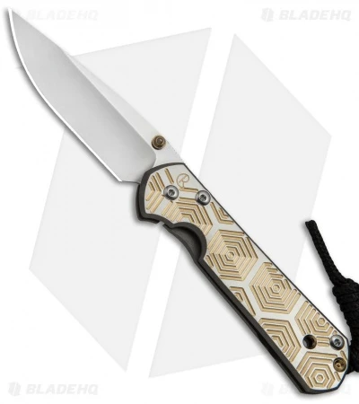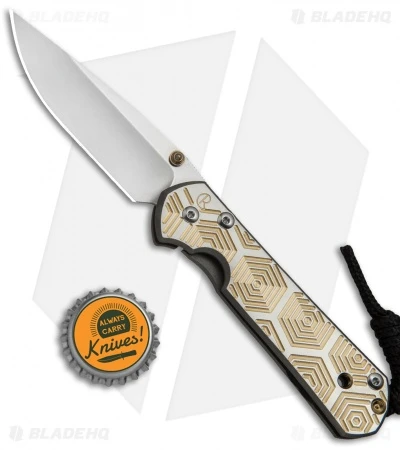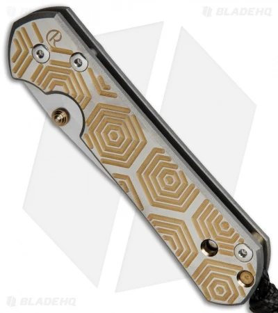 This Small Sebenza 21 features a satin finished titanium handle face with a “Gold Hex” computer generated graphic (CGG). The framelock and pocket clip are bead blast finished. It is outfitted with a polished S35VN stainless steel blade with a thumb lug. Includes lanyard and leather pouch.